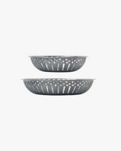 Présentez vos fruits dans ces élégants paniers en acier inoxydable brossé au look vintage . Le motif perforé complexe permet à l'air de circuler, gardant le pain croustillant, les fruits frais et les apéritifs tentants, tandis que la finition brossée sophistiquée capte une lumière subtile sur votre table.